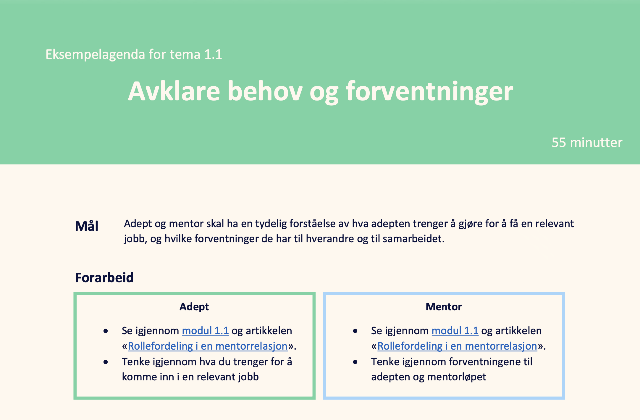 Uansett om du tar denne modulen alene, med en mentor eller i et jobbnettverk, er det lurt å ha en agenda. Nedenfor finner du et forslag fra oss, som du kan laste ned og tilpasse etter dine behov.