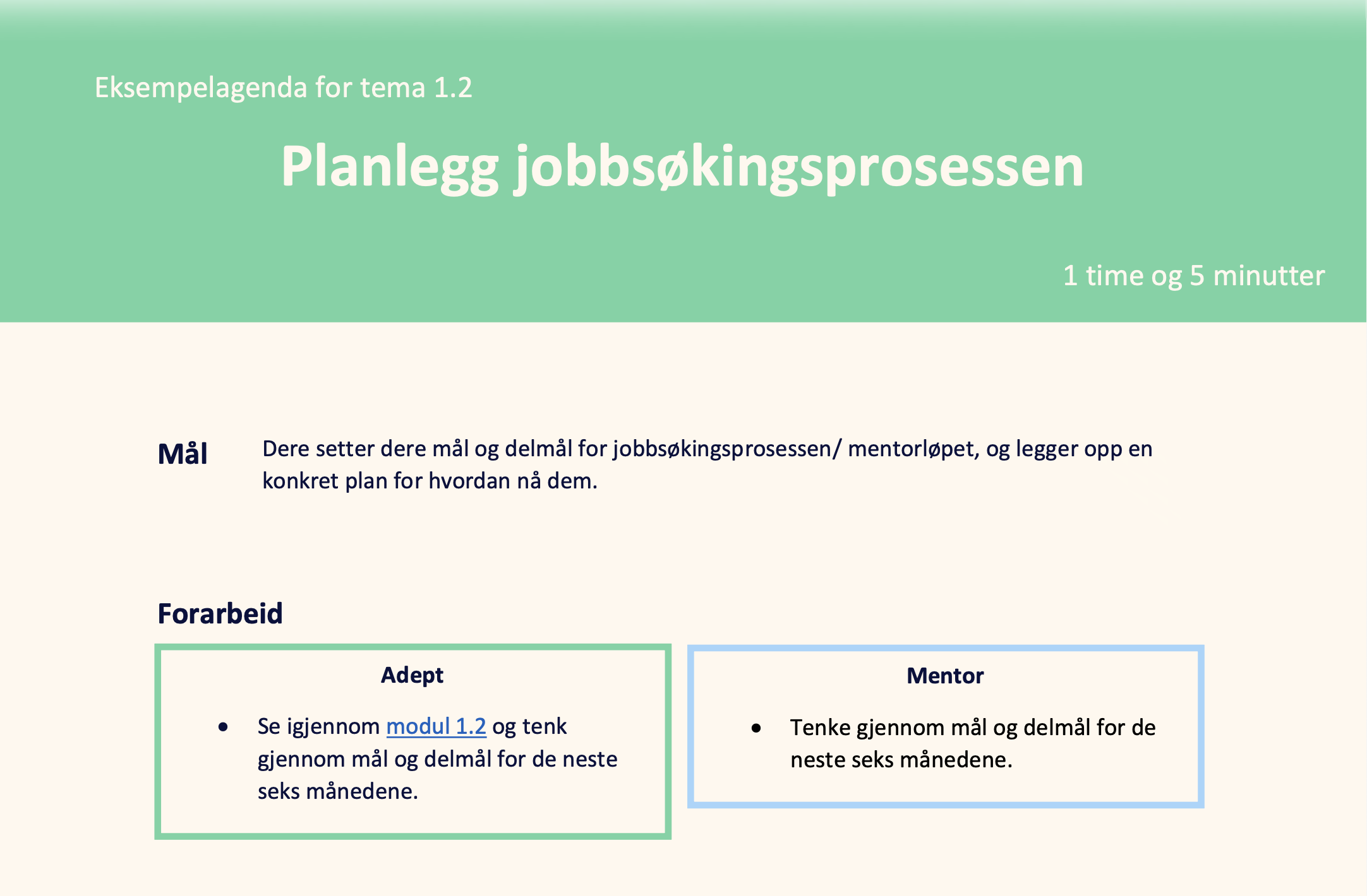 Uansett om du tar denne modulen alene, med en mentor eller i et jobbnettverk, er det lurt å ha en agenda. Nedenfor finner du et forslag fra oss, som du kan laste ned og tilpasse etter dine behov.